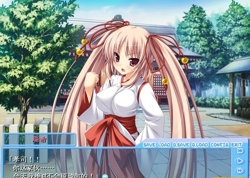 青梅竹马的来狗神社的巫女,『鸨叶瑞希』追赶着主人公『乌丸孝司』,于是主人公逃进了神社里。