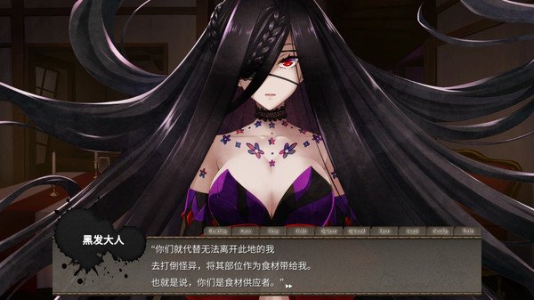 《黑发大人的晚餐》游戏中,被名为“黑发大人”的怪异附身的主角和同伴等三人,受到她的命令而前去收集怪异的食材。主角需要用能够听到人们心声的‘黑发大人之耳’,以及能够攻击怪异的 ‘黑发大人之手’,与潜藏在日常中的黑暗进行战斗。