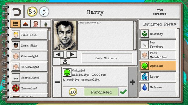 - 创造角色:可以选择预设角色,或创造一位自定义角色:选择各种特质来决定你的身体素质,精神特质,技艺能力和初始状态。