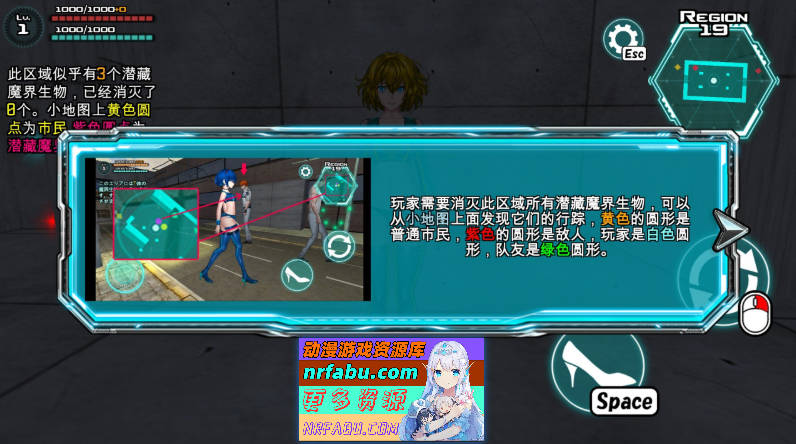 玩家需要消灭此区域所有潜藏魔界生物,可以从小地图上面发现它们的行踪,黄色的圆形是普通市民,紫色的圆形是敌人,玩家是白色圆形。