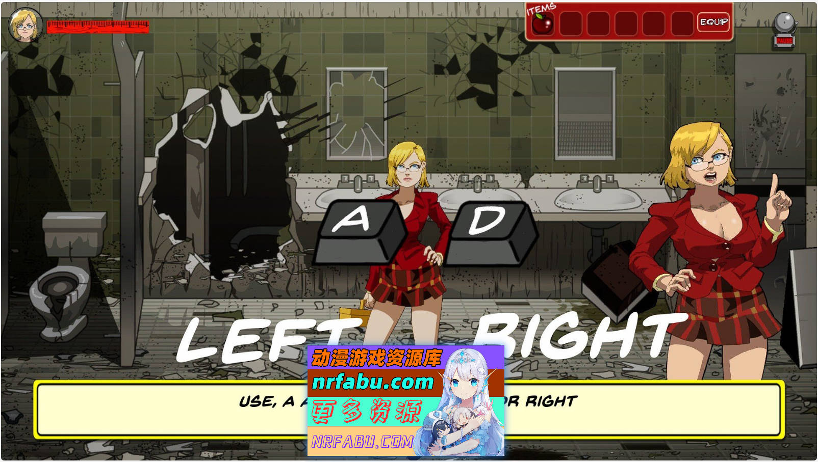 玩家操作金发短裙的女教师,用扔粉笔和高跟鞋飞腿打退来袭的僵尸。