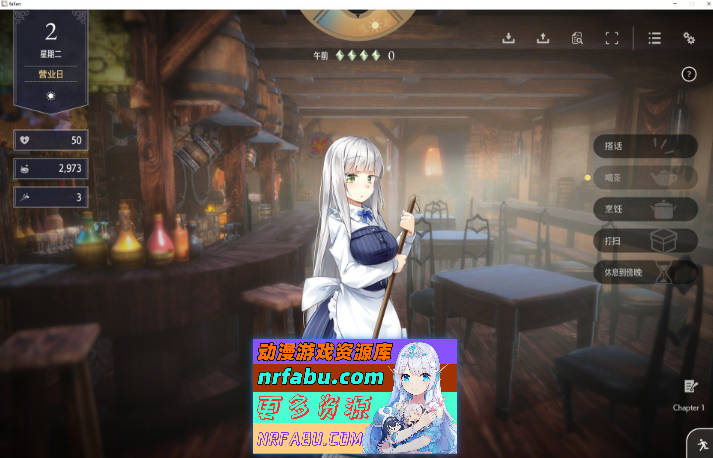 您能在酒馆的店内或寝室和女主角进行互动与交流。