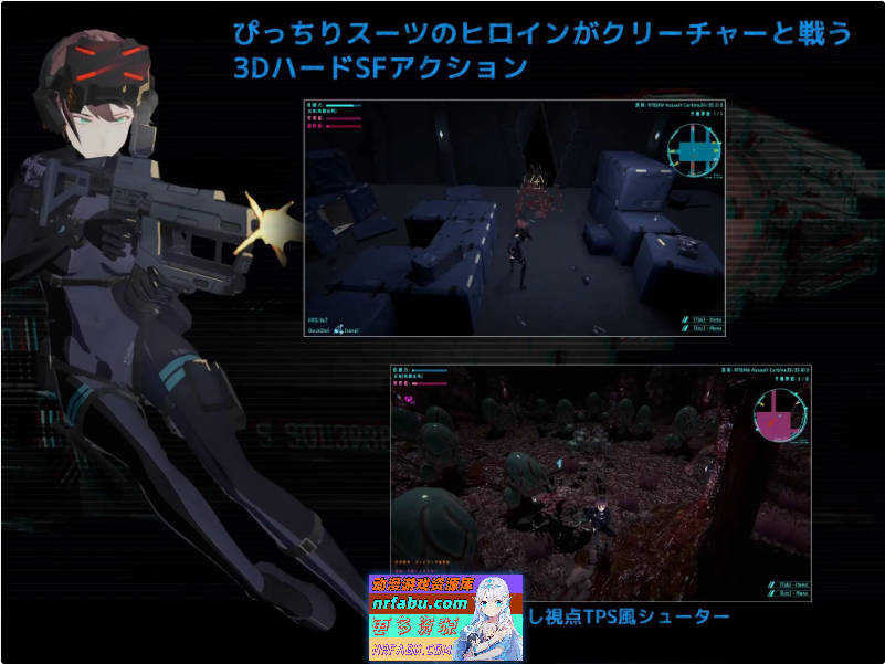 一款俯视角科幻射击/动作游戏,主角为身着紧身作战服与战术背带的女英雄。