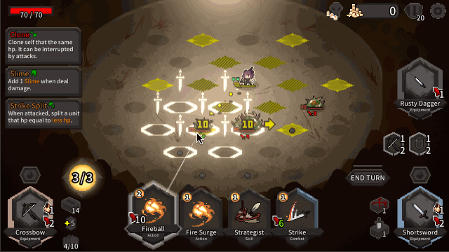 不同常见牌组构筑游戏只要思考攻击或防御,加入战棋元素后则需要位移寻找生存空间、交换位置让敌人自我残杀、利用地形击获得优势。